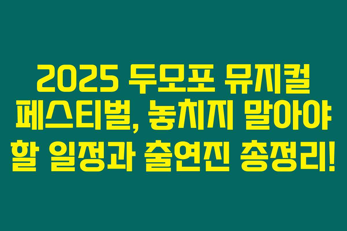 2025 두모포 뮤지컬 페스티벌에 대한 정보가 점점 쏟아지고 있어요! 뮤지컬을 사랑하는 분들이라면 이러한 특별한 이벤트는 반드시 알아두셔야 해요. 올 여름 뮤지컬의 매력 속으로 빠져들 준비 되셨나요? 곧 다가올 두모포 뮤지컬 페스티벌의 일정과 출연진 그리고 공연 정보를 아래를 읽어보시면 확인하실 수 있어요.