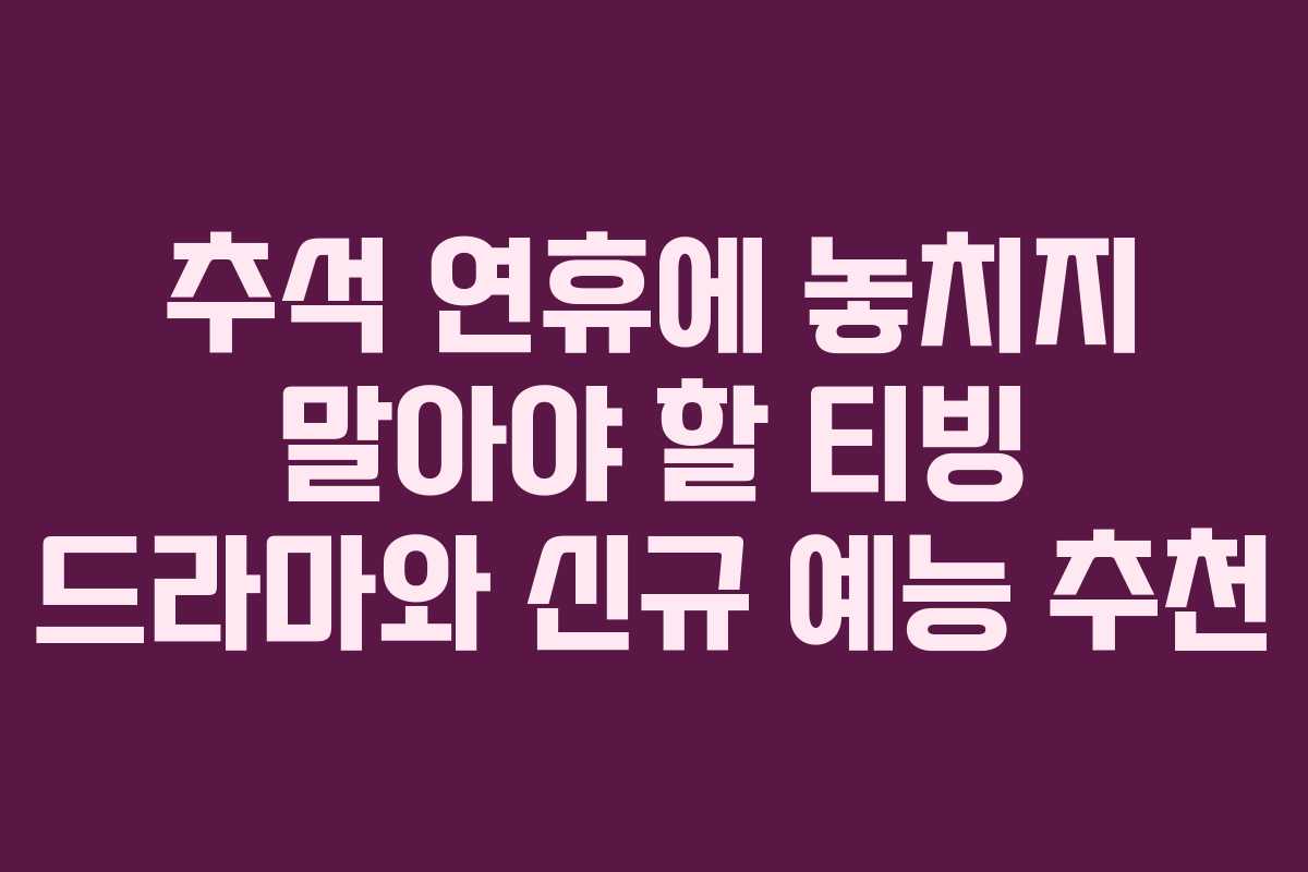 이번 추석 연휴는 티빙에서 추천하는 드라마와 예능으로 풍성한 시간을 보내보세요. 드라마의 다양한 장르와 깊이 있는 이야기들은 여러분의 마음을 따뜻하게 해줄 것입니다. 연휴 동안 가족이나 친구들과 함께 즐거운 시간을 보내며, 소중한 추억을 만들어보세요.