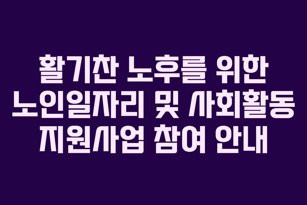 노인일자리 및 사회활동 지원사업은 60세 이상의 어르신들에게 다양한 사회 활동 기회를 제공하여 활기찬 노후 생활을 지원하는 프로그램입니다. 이 사업에 참여하고자 하는 분들을 위해 모집 정보를 안내드립니다.