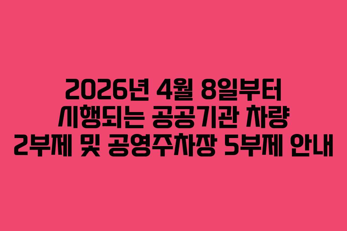 2026년 4월 8일부터 시행되는 공영주차장 5부제는 지방정부와 공공기관이 운영하는 약 3만 개의 유료 주차장에 적용된다. 이 조치는 차량 번호 끝자리에 따라 주차가 제한되며, 특정 차량군인 장애인 차량, 친환경차, 긴급 차량 등은 제외된다. 주차장 이용 시에는 반드시 요일별로 차량 번호를 확인해야 하며, 이를 통해 주차장 혼잡도를 줄이고 에너지를 절약할 수 있다.